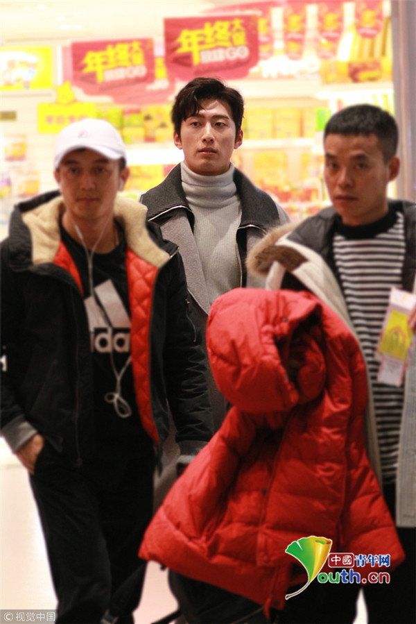 2017年12月11日,無錫,竇驍灰大衣帥氣現(xiàn)身無錫機(jī)場,見攝影師拍圖隔著玻璃比V,暖男無疑了!