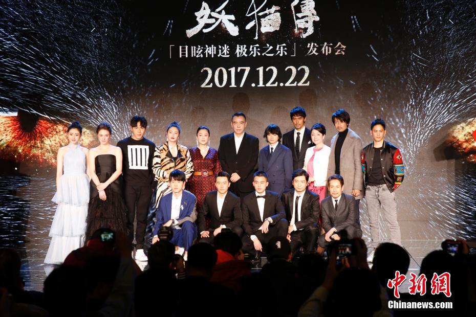 12月17日,由陳凱歌導(dǎo)演的賀歲奇幻題材電影《妖貓傳》在北京舉行全球首映發(fā)布會(huì),導(dǎo)演陳凱歌,制片人陳紅攜主演黃軒、染谷將太、張雨綺、秦昊、張榕容、張魯一、劉昊然、阿部寬、松坂慶子等亮相。影片改編自日本作家夢(mèng)枕貘的魔幻系列小說(shuō)《沙門(mén)空?!?,將于22日起在中國(guó)內(nèi)地上映。圖為眾主創(chuàng)合影。中新社記者 李慧思 攝