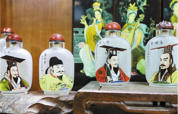 談及創(chuàng)作過(guò)程,楊藝說(shuō),鼻煙壺內(nèi)畫(huà)的制作,一般是在水晶壺或素玻璃壺內(nèi)壁,用特制的細(xì)筆,蘸取少許墨汁顏料,從小口中深入瓶中,反手作畫(huà)。創(chuàng)作內(nèi)畫(huà),在常人看來(lái),不可思議之處是有限的空間以及需要反手作畫(huà),這也是每一個(gè)內(nèi)畫(huà)師面臨的主要難題所在,“創(chuàng)作內(nèi)畫(huà)時(shí),需要在這盈寸天地間做到手指和筆桿揮灑自如,這極其考驗(yàn)一個(gè)人的耐性。一手執(zhí)壺,一手作畫(huà),作畫(huà)時(shí)需要在壺內(nèi)反手描繪,如此,才能讓人們?cè)谕獠靠吹秸娴漠?huà)像結(jié)構(gòu)?!眱?nèi)畫(huà)的難度還在于,要長(zhǎng)期低頭畫(huà)畫(huà),因此還導(dǎo)致頸椎疼痛,中途為了治療疼痛休畫(huà)了好長(zhǎng)一段時(shí)間。