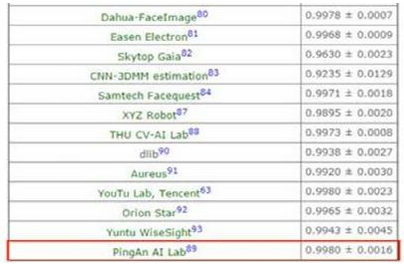 5月9日,國際權(quán)威人臉識別數(shù)據(jù)庫LFW(Labeled Faces in the Wild)最新公布的測試結(jié)果顯示,平安集團旗下平安科技的人臉識別技術(shù)以99.8%的識別精度和最低的波動幅度領(lǐng)先國內(nèi)外知名公司,位居世界第一。