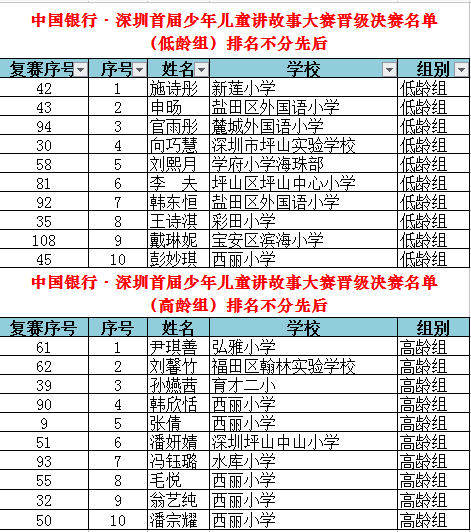 從全市近百所學(xué)校、社會(huì)賽區(qū)報(bào)名的萬(wàn)余名參賽選手中脫穎而出的選手們齊聚復(fù)賽賽場(chǎng),比賽競(jìng)爭(zhēng)異常激烈。晉級(jí)復(fù)賽的225人(其中高齡組104人,低齡組121人)使出渾身解數(shù),講述著自己喜歡的故事,最終高、低齡組每組各10人晉級(jí)決賽,低齡組新蓮小學(xué)施詩(shī)彤、鹽田區(qū)外國(guó)語(yǔ)小學(xué)申旸等10位選手,高齡組弘雅小學(xué)尹琪善、福田區(qū)翰林實(shí)驗(yàn)學(xué)校劉馨竹等10位選手“殺出重圍”,奪得決賽名額。