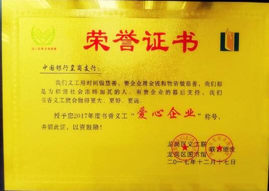 近日,深圳市龍崗區(qū)義工聯(lián)、龍崗圖書館書香義工2017年度總結(jié)大會在龍崗區(qū)文體中心召開。大會授予中國銀行深圳皇崗支行書香義工“愛心企業(yè)”稱號,并聯(lián)合頒發(fā)榮譽證書。