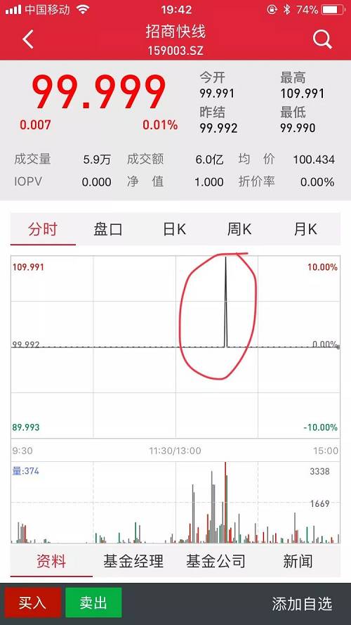 基金君大致講一下這個過程。2018年3月13日,招商保證金快線A在二級市場盤中價格出現(xiàn)了109.991的超高成交價,成交金額5511.95萬元,業(yè)內(nèi)人士看來,這大概率是由“烏龍指”所致,不過,這不小心的手一抖,粗略估算就要浮虧約500萬,一套房就這么沒了。