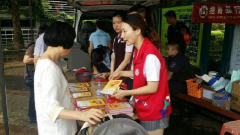社區(qū)工作人員向居民介紹便民服務活動