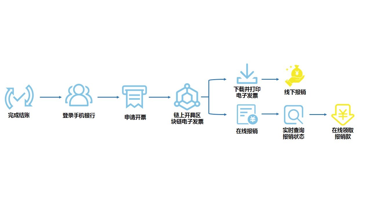 完成試運行階段后,招商銀行客戶在結(jié)賬后即可通過手機自助申請開票和一鍵報銷,發(fā)票信息將實時同步至企業(yè)和稅務機關(guān),平臺支持線上領(lǐng)取報銷款,報銷狀態(tài)實時查詢。