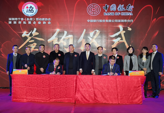 深圳新聞網(wǎng)1月3日訊 1月3日下午,作為深圳改革開(kāi)放與經(jīng)濟(jì)發(fā)展的重要力量和代表,深圳市個(gè)體(私營(yíng))勞動(dòng)者協(xié)會(huì)(下稱“深個(gè)協(xié)”)隆重舉辦“改革開(kāi)放四十周年慶典“,并與唯一一家銀行——中國(guó)銀行深圳市分行簽訂全面戰(zhàn)略合作協(xié)議。中國(guó)個(gè)體勞動(dòng)者協(xié)會(huì)會(huì)長(zhǎng)鐘攸平、深圳市市場(chǎng)和質(zhì)量監(jiān)督管理委員會(huì)書記夏昆山、深圳市個(gè)體(私營(yíng))勞動(dòng)者協(xié)會(huì)會(huì)長(zhǎng)曾宏興,以及中國(guó)銀行深圳市分行行長(zhǎng)姚華明、副行長(zhǎng)葉新階出席了簽約儀式。深個(gè)協(xié)會(huì)長(zhǎng)曾宏興和深圳中行副行長(zhǎng)葉新階作為雙方代表簽署了協(xié)議。