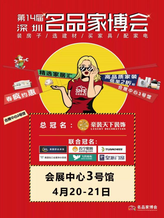 由豪裝天下裝飾集團總冠名并聯(lián)合蘇寧易購、美國舒達床墊、飛鴿地板、皇派門窗共同助力的第14屆深圳名品家博會,將于4月20日—21日舉行在深圳會展中心舉辦。千余個家居一線品牌、萬余款家裝大牌產(chǎn)品齊聚本屆深圳家博會,將為深圳數(shù)萬裝修家庭帶來驚喜與福利。