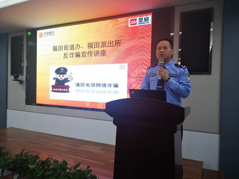 深圳新聞網(wǎng)訊 近年來(lái),信息詐騙案件多發(fā),詐騙分子手段層出不窮,不僅給廣大市民造成了財(cái)產(chǎn)損失,更加將社會(huì)的反詐騙宣傳教育工作推向重要位置。為了普及廣大金融消費(fèi)者的反詐騙知識(shí),同時(shí)讓知識(shí)宣傳更接地氣,近日,寧波銀行深圳分行攜手深圳福田街道辦、福田派出所對(duì)皇庭中心大廈100多位商戶代表,開展了一場(chǎng)教育意義深刻的反詐騙知識(shí)講座。福田區(qū)副所長(zhǎng)羅躍、福田派出所社區(qū)隊(duì)隊(duì)長(zhǎng)莫予寶、福田街道辦政法辦主任馬建忠、皇庭物業(yè)總經(jīng)理吳海兵、寧波銀行深圳分行監(jiān)察保衛(wèi)部副總經(jīng)理陳久桐等9位警銀領(lǐng)導(dǎo)代表出席了本次活動(dòng)。