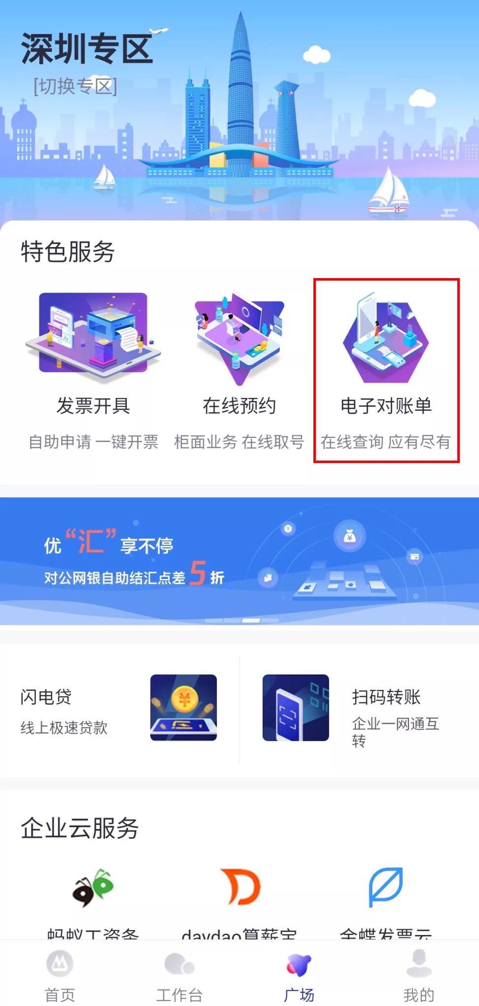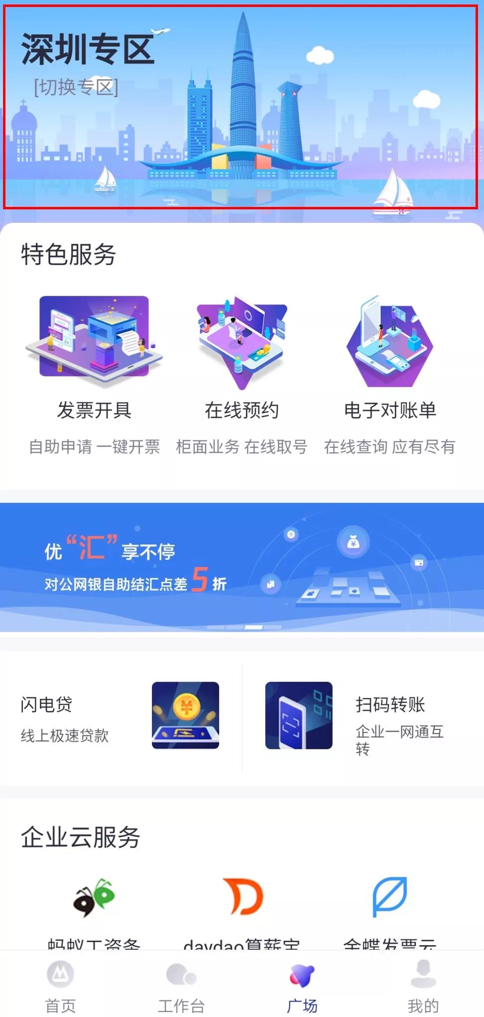 打開招商銀行企業(yè)App,點(diǎn)擊“廣場(chǎng)”板塊,找到深圳專區(qū)。