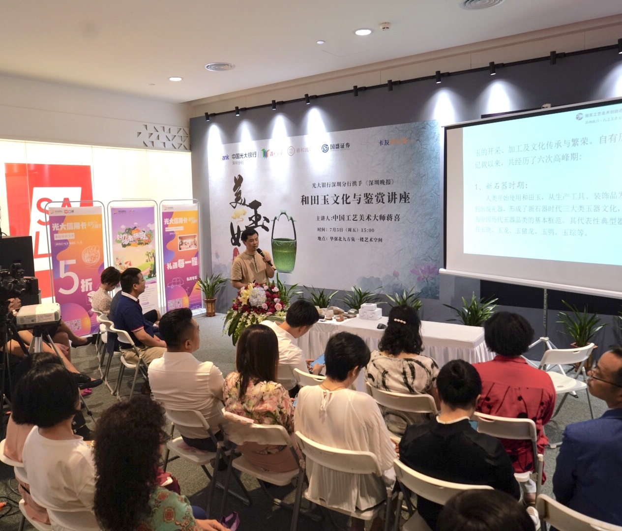 深圳新聞網(wǎng)7月5日訊(記者朱琳 通訊員李昕)7月5日,光大銀行深圳分行聯(lián)合深圳晚報(bào),共同推出中國(guó)工藝美術(shù)大師蔣喜“和田玉文化與鑒賞”講座?;顒?dòng)邀請(qǐng)中國(guó)工藝美術(shù)大師、中國(guó)玉石雕刻大師、國(guó)家非物質(zhì)文化遺產(chǎn)(蘇州玉雕)代表性傳承人、研究員級(jí)高級(jí)工藝美術(shù)師蔣喜先生,向光大銀行的VIP客戶及市民,剖析和田玉文化的價(jià)值,傳授和田玉的鑒賞方法,弘揚(yáng)中華傳統(tǒng)文化。