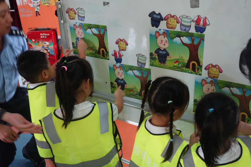 熊警官從交通工具講起,分別講述了乘坐不同交通工具所帶來的風(fēng)險(xiǎn)及注意事項(xiàng),并通過幽默風(fēng)趣的“兒童安全座椅”小視頻,提醒在座的小朋友及家長(zhǎng)要注意細(xì)節(jié),具有防范風(fēng)險(xiǎn)的意識(shí)。在互動(dòng)游戲環(huán)節(jié),熊警官通過與小朋友們的互動(dòng),講解了紅綠燈的來源、日常的交通標(biāo)識(shí)以及過馬路的規(guī)則。現(xiàn)場(chǎng)的同學(xué)們也非常踴躍,在“被看見才安全”環(huán)節(jié)時(shí),許多小朋友主動(dòng)上臺(tái),給小兔子穿上最亮最顯眼的衣服,使其成為最靚的仔。