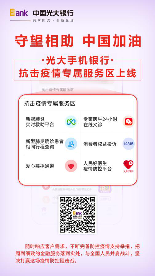 其中,專家醫(yī)生24小時(shí)在線義診是由光大銀行與平安好醫(yī)生APP合作推出,可在線免費(fèi)提供專家醫(yī)生義診服務(wù),并提供多類常見藥物的購(gòu)買服務(wù);新冠肺炎實(shí)時(shí)救助平臺(tái)是由光大銀行與微醫(yī)互聯(lián)網(wǎng)總醫(yī)院聯(lián)合上線,平臺(tái)可提供最新疫情動(dòng)態(tài)、疫情防御、7*24小時(shí)在線免費(fèi)專業(yè)醫(yī)生咨詢等功能;愛心募捐通道提供多個(gè)渠道的賑災(zāi)捐款項(xiàng)目,讓愛心匯聚防控疫情斗爭(zhēng)第一線;人民好醫(yī)生疫情防控中央平臺(tái)第一時(shí)間科普權(quán)威知識(shí),公布疫情防護(hù)物資供需發(fā)布;確診患者相同行程查詢功能可為客戶提供火車車次、飛機(jī)航班號(hào)、城市等方式,查看是否有肺炎患者同行。