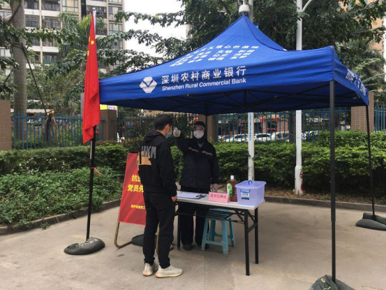 隨著疫情防控形勢的發(fā)展,深圳各街道各社區(qū)都不斷加強(qiáng)疫情防控,在道路口、社區(qū)出入口、樓棟出入口對進(jìn)出車輛和人員進(jìn)行篩查。在燕羅街道、松崗街道轄內(nèi)的道路卡口、社區(qū)門口、街道養(yǎng)老院、工廠等防疫檢查站點(diǎn),記者看到很多印有深圳農(nóng)商行名稱的藍(lán)色帳篷。一頂頂帳篷就像一把把‘保護(hù)傘’,為防控工作人員提供了遮風(fēng)擋雨的場所,也守護(hù)著轄區(qū)居民的健康。