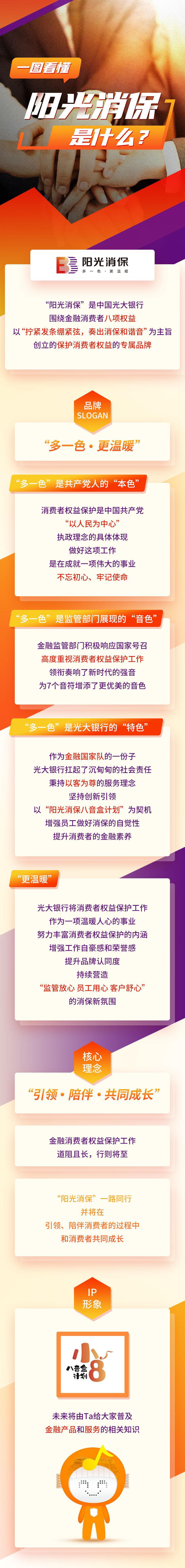 中國(guó)光大銀行“陽(yáng)光消?!逼放茦?biāo)識(shí),貫徹了“一個(gè)光大”的品牌管理原則,突出了金融消費(fèi)者權(quán)益保護(hù)與銀行現(xiàn)有業(yè)務(wù)的依存及拓展關(guān)系,在全面貫通現(xiàn)有服務(wù)基礎(chǔ)上,針對(duì)金融消費(fèi)者權(quán)益的“八項(xiàng)基本權(quán)益”,向全社會(huì)做出了“引領(lǐng)·陪伴·共同成長(zhǎng)”的莊嚴(yán)承諾。