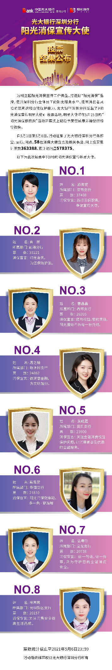 深圳新聞網(wǎng)·見(jiàn)圳客戶(hù)端2021年5月8日訊 昨日,光大銀行深圳分行“陽(yáng)光消保宣傳明星大使”線(xiàn)上投票圓滿(mǎn)結(jié)束,從58名宣傳大使中投票產(chǎn)生了賴(lài)春妮、肖雨、曹晶晶、周之靖、黃曉霞、蔣易萱、曾粵玲、林思思8名陽(yáng)光消保宣傳明星大使。明星大使將在5月15日的“陽(yáng)光消保健康跑”活動(dòng)開(kāi)幕式上被授予榮譽(yù)勛章并接受行領(lǐng)導(dǎo)授旗。5月1日,光大銀行深圳分行發(fā)起了“陽(yáng)光消保宣傳明星大使”線(xiàn)上投票,旨在樹(shù)立起陽(yáng)光消保宣傳工作典型,打造“陽(yáng)光消?!逼放疲嵘钲诜中腥w員工的陽(yáng)光服務(wù)水平,提高消費(fèi)者風(fēng)險(xiǎn)防范意識(shí)和自我保護(hù)能力,提升光大在深圳地區(qū)的品牌影響力。投票活動(dòng)得到社會(huì)熱烈響應(yīng),據(jù)統(tǒng)計(jì),此次累計(jì)票數(shù)達(dá)363388次。