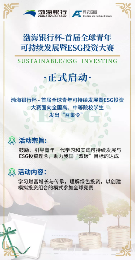 讀特客戶端 ·深圳新聞網(wǎng)8月16日訊 (通訊員 張曦)近日,由渤海銀行股份有限公司(以下簡(jiǎn)稱“渤海銀行”)冠名,評(píng)安國(guó)蘊(yùn)(北京)科技有限公司(以下簡(jiǎn)稱“評(píng)安國(guó)蘊(yùn)”)聯(lián)合 ACME現(xiàn)代經(jīng)濟(jì)學(xué)社、 GIC全球投資委員會(huì)共同承辦的首屆“渤海銀行杯 ·全球青年可持續(xù)發(fā)展暨 ESG投資大賽”正式啟動(dòng)!8月9日起,活動(dòng)冠名方——渤海銀行面向年滿16周歲的全國(guó)高、中等院校學(xué)生發(fā)出了“召集令”。