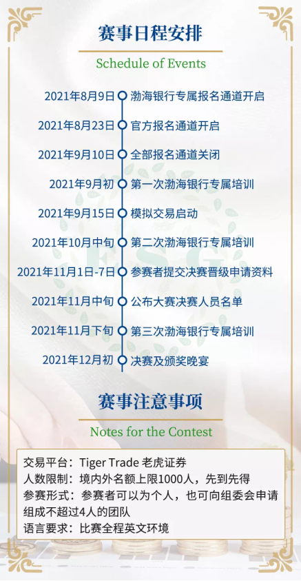 活動(dòng)冠名方——渤海銀行希冀以本賽事的舉辦為契機(jī),通過(guò)緊張激勵(lì)而又活潑有趣的模擬投資組合競(jìng)賽形式、寓教于樂(lè),樹(shù)立并培養(yǎng)青年一代對(duì)于財(cái)富增長(zhǎng)與傳承的正確理念,引導(dǎo)年輕人理解并實(shí)踐綠色投資,促進(jìn)青年一代“財(cái)商”理念與能力的全面提升。