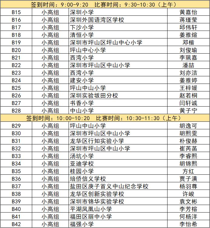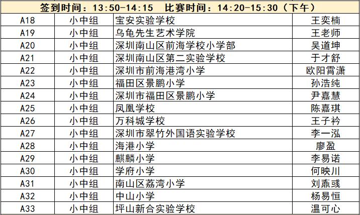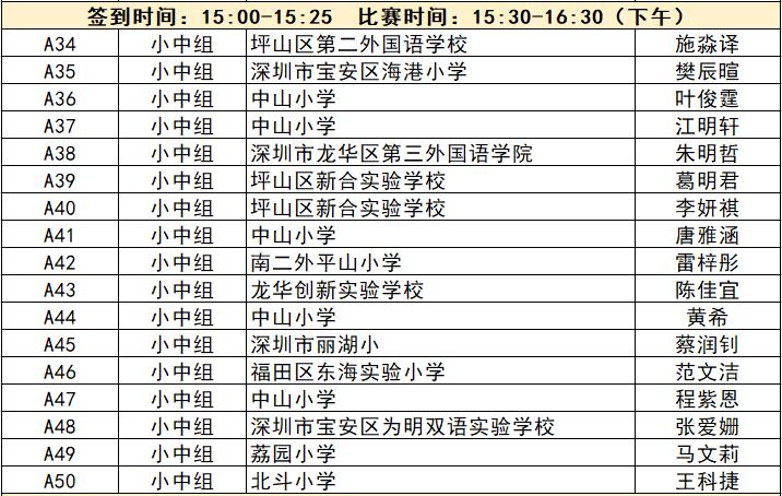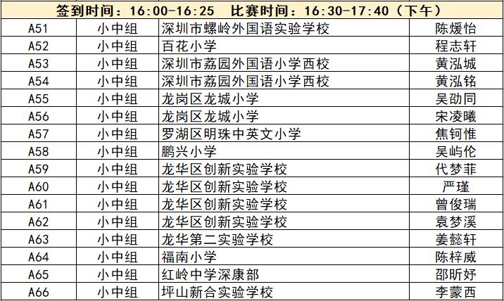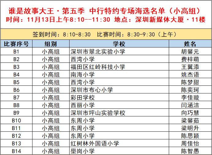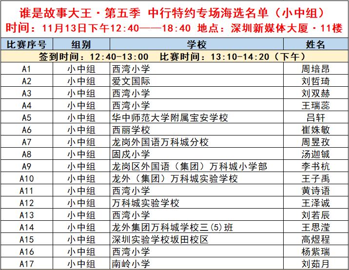“誰是故事大王·第五季”分為小中組和小高組,此次中行特約專場海選報(bào)名的學(xué)生將以脫稿的形式,不限主題,在限時(shí)5分鐘內(nèi),講述積極健康向上的故事。評委老師們將從四個(gè)維度進(jìn)行評分,其中內(nèi)容占50%、表現(xiàn)技巧占30%、儀態(tài)占10%,以及時(shí)間掌控、創(chuàng)意特色呈現(xiàn)等占10%。最終,本場活動(dòng)將選拔出部分學(xué)生晉級(jí)“誰是故事大王·第五季”深圳市復(fù)賽,他們將和來自指定校園分賽區(qū)、特約專場以及線上分賽區(qū)的選手一起爭奪深圳市決賽名額?,F(xiàn)將上場順序(即所在小組的序號(hào)順序)、名單、簽到時(shí)間、比賽時(shí)間公布如下:
