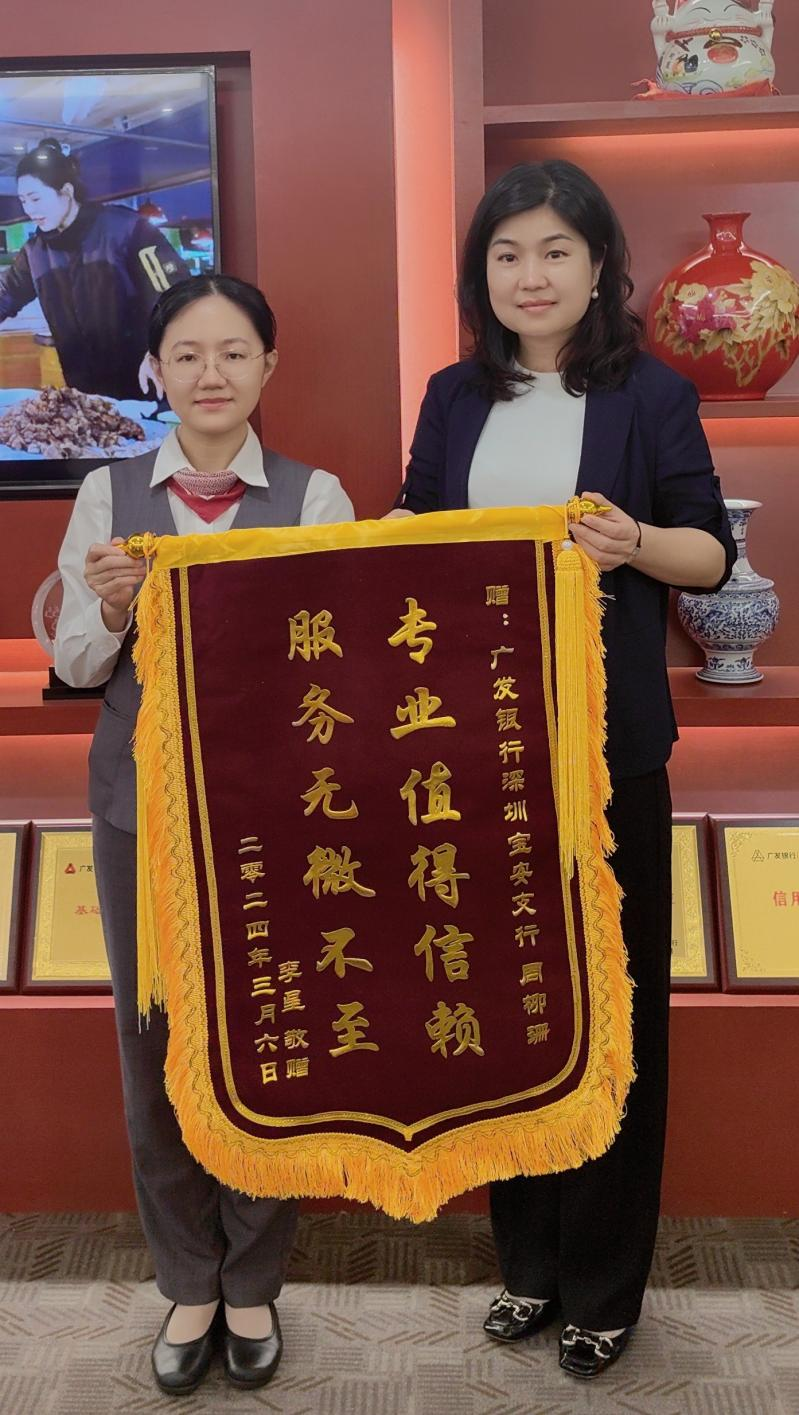 深圳新聞網(wǎng)2024年5月11日訊(記者 朱琳)“真的太感謝廣發(fā)銀行了!要不是廣發(fā)銀行專業(yè)高效的服務(wù),我這筆貨款都不知何時能付出去!”小微企業(yè)主李先生握著廣發(fā)銀行深圳寶安支行服務(wù)經(jīng)理周柳珊的手激動地說,隨后將一面印有“服務(wù)無微不至,專業(yè)值得信賴”的錦旗送到她的手中,向該行熱情、高效、暖心的服務(wù)表示感謝。錦旗上十二個金燦燦的大字寄托了客戶對廣發(fā)銀行沉甸甸的信任和堅定不移的支持。
