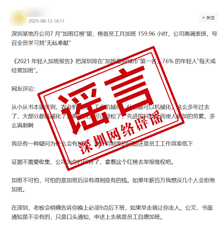 近日,一則《關(guān)于加班的通報表揚(yáng)》在社交平臺引發(fā)熱議。部分網(wǎng)帖將涉事企業(yè)與深圳強(qiáng)行關(guān)聯(lián),冠以“深圳某公司”名義進(jìn)行傳播,并稱深圳存在普遍的加班現(xiàn)象。經(jīng)核實(shí),涉事企業(yè)非深圳企業(yè)。