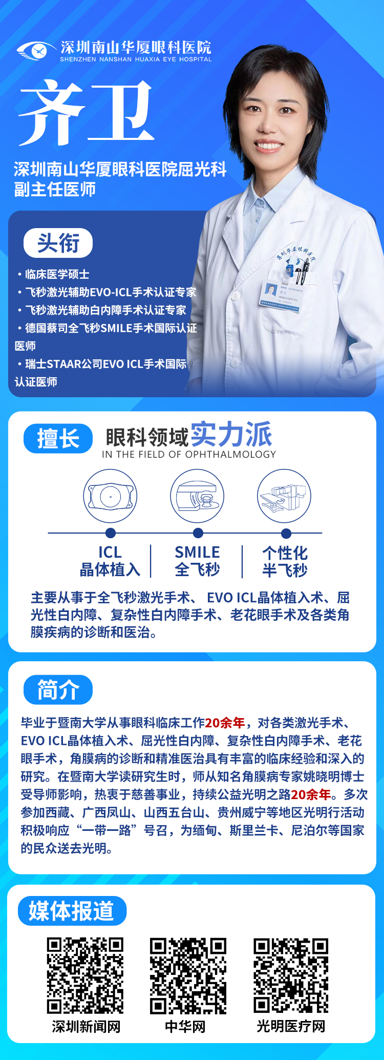 畢業(yè)于暨南大學(xué)的齊衛(wèi)主任,師從知名角膜病專(zhuān)家姚曉明博士,從求學(xué)時(shí)起就對(duì)眼科事業(yè)的熱愛(ài)。臨床工作中,而且她在激光手術(shù)、EVO ICL 晶體植入術(shù)、屈光性白內(nèi)障手術(shù)等領(lǐng)域積累了深厚造詣。