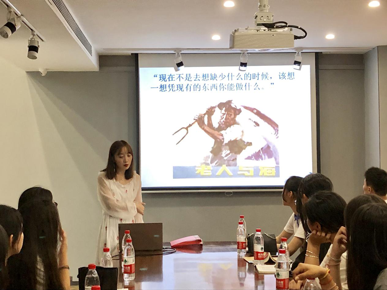 《老人與海》通過講述一個(gè)老漁夫的故事,揭示了人類共同的命運(yùn),給讀者帶來關(guān)于勇氣、不屈不撓、與命運(yùn)作斗爭的精神啟迪。圍繞“生而為人,請務(wù)必戰(zhàn)斗到底”這一主題,邵洋提出了“是選擇放棄,還是一往直前?”這一問題,引起在座同學(xué)的思考。隨后,她又通過解讀《老人與?!分械挠飨笈c藝術(shù)、生命與理想,為同學(xué)們總結(jié)值得學(xué)習(xí)的寫作思路。
