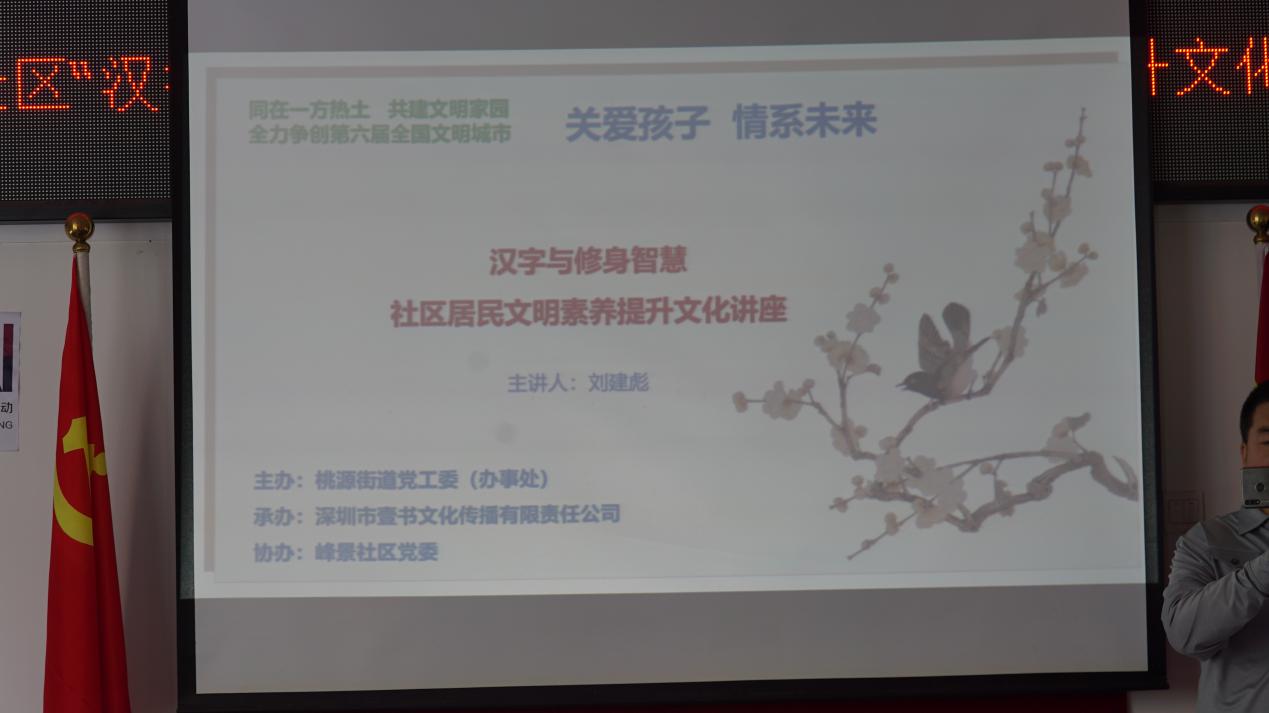 11月8日下午,該項(xiàng)目首場(chǎng)講座在峰景社區(qū)工作站拉開(kāi)了序幕,本次講座由桃源街道黨工委(辦事處)主辦、深圳市壹書(shū)文化傳播有限責(zé)任公司承辦、峰景社區(qū)黨委協(xié)辦,邀請(qǐng)到壹讀書(shū)會(huì)創(chuàng)始人、知名閱讀推廣人、《漢字與修身智慧》的作者劉建彪擔(dān)任主講嘉賓。在深圳爭(zhēng)創(chuàng)全國(guó)文明城市的當(dāng)下,桃源街道辦積極響應(yīng)市委市政府的號(hào)召,不斷探索籌劃、推陳出新,以“‘同在一方熱土共建文明家園’——全力爭(zhēng)創(chuàng)第六屆全國(guó)文明城市”為文明創(chuàng)建標(biāo)語(yǔ),開(kāi)展題為“學(xué)習(xí)漢字與修身智慧,以傳統(tǒng)文化力量促文明”的文化講座,為創(chuàng)建文明城市貢獻(xiàn)一份力量。
