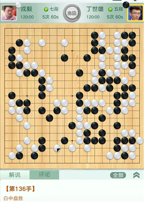 第三臺(tái)慢棋,由深圳隊(duì)戎毅七段執(zhí)白對(duì)陣衢州隊(duì)丁世雄五段。開(kāi)局右下角變化黑棋虧損。之后白棋右上角試應(yīng)手時(shí),黑棋選擇脫先吃白中間殘子失誤。白棋棄掉幾子在右上黑空先手活出,大幅領(lǐng)先。之后白棋安全運(yùn)轉(zhuǎn)直至終局,戎毅執(zhí)白中盤勝丁世雄。