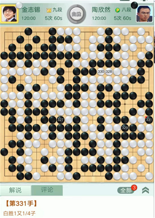 第二臺(tái)主將臺(tái),由深圳隊(duì)陶欣然八段執(zhí)黑對(duì)陣衢州隊(duì)韓國(guó)外援、世界冠軍金志錫九段。開(kāi)局下方戰(zhàn)斗雙方各有失誤,局面依然均勢(shì)。之后左上角形成打劫,白棋棄劫右上打穿黑空各有所得。黑棋攻擊左上角白棋時(shí)候白棋應(yīng)對(duì)失誤,黑棋取得領(lǐng)先。白棋看到形勢(shì)不利放出勝負(fù)手,打入上邊黑空過(guò)分,黑棋反擊后白棋極其危險(xiǎn)。關(guān)鍵時(shí)候黑棋鼠標(biāo)點(diǎn)錯(cuò),給自己留下一個(gè)斷點(diǎn),被白棋活出后,局面難以挽回,陶欣然執(zhí)黑1又1/4子負(fù)金志錫。