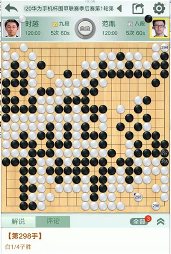 慢棋臺第四臺由深圳隊的時越九段執(zhí)白對陣民生隊的范胤八段。中盤右邊白棋進入黑空形成打劫,劫活后局面領(lǐng)先。中央黑棋進攻白棋時候失誤,白棋優(yōu)勢擴大。之后黑棋左邊行棋時候,白棋一直沒有脫先搶占右邊大棋,而是在左邊連續(xù)失誤并且落了后手。被黑走到右邊后黑棋大幅領(lǐng)先。之后右下角形成復雜的打劫,黑棋可以選擇走成三劫循環(huán)和棋后加賽,但是黑棋判斷即便放棄和棋也是局面有利。實戰(zhàn)白棋一直不補搶收官子,最終判斷獲勝時候?qū)⑷傺h(huán)變化解消,白棋1/4子獲勝。時越1/4子勝范胤。