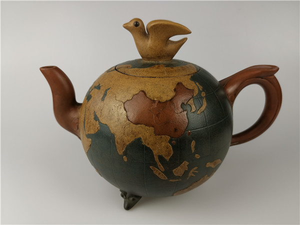 再說第二件,《世界和平壺》的回歸。2020年6月,唐朝霞老師的愛人韋強(qiáng)先生正在深圳商會開會。其間,一次會議結(jié)束后剛回到酒店時手機(jī)響起!一位美國的朋友電話給他告訴他一個天大的喜訊:在日本發(fā)現(xiàn)了唐朝霞爺爺唐鳳芝的傳奇作品“世界和平壺”。韋強(qiáng)介紹說,1943年,因為唐鳳芝是民國時的紫砂大師,民國政府委托唐鳳芝先生特制了“世界和平壺”,隨后,由宋美齡女士在赴美國演講時一起帶了過去,象征著世界和平之意!想不到時隔80年,竟然在日本出現(xiàn)了。韋強(qiáng)說,看到實物照片時,真的太激動了!此前,他們在家里只看到過爺爺設(shè)計的圖紙,從沒看到過實物,接到這意外訊息真的是驚喜萬分!真是難以入眠!通過一系列的協(xié)調(diào),日本的藏家愿意轉(zhuǎn)讓,讓激動的心更加興奮了,立即訂了機(jī)票,著手辦理“回歸事宜”。當(dāng)他終于在海關(guān)拿到了這件作品,包裝非常完好,便緊緊的抱在胸前:飄泊海外80年的“思念”終于落定了,爺爺唐鳳芝的“世界和平壺”終于回家了。韋強(qiáng)說:當(dāng)時的心情無法用言語形容!只覺得天空格外清新、陽光格外燦爛!
