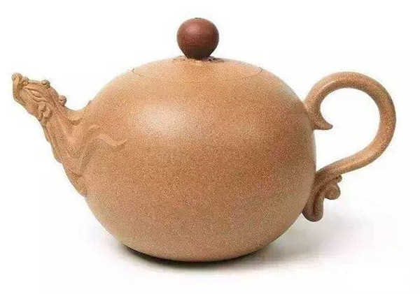 第三件,《丹鳳朝陽壺》以鳳首為壺流,祥云做壺把,鳳凰昂首鳴唱,振羽欲飛,其線條婉轉(zhuǎn),儀態(tài)優(yōu)美,肖形傳神,壺身圓潤飽滿。泥料精心選配梨皮砂,色澤金黃,質(zhì)感豐富,壺鈕泥色變化為朱色,仿佛一輪朝陽在金色的云霞中一躍而出,帶出一片光明。此壺寓意丹鳳呈祥,有完美、吉祥、和諧之涵意。
