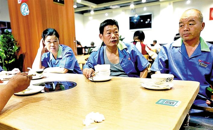 在店里吃飯的人群里,有一張臺全是清一色的藍色工作服,特別顯眼。“我們每天都會來這里吃早餐,差不多有一年時間了,這里的老板太好了,希望他能一直開下去。”這幾個大叔、大嬸是周邊物業(yè)的清潔工人,他們每天早上5點鐘就上崗工作,忙完就到了6-7點,又餓又累,有一碗熱騰騰的早餐是一件非常幸福的事,而這種開心快樂的事情在這里發(fā)生了。吳姓清潔工說,這里的老板和員工很好,大家來這里吃粥,沒有感到半點不自在,就像在自己家一樣。