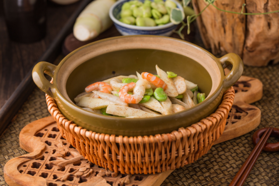 食材多來(lái)自水澤,藕帶、菱角、茭白、蠶豆瓣、大蝦仁,自制蝦醬爆炒起香,時(shí)蔬的白綠點(diǎn)綴蝦仁的淡粉,如青荷托芙蓉之色,砂鍋盛上,滋滋作響,讓人眼前浮現(xiàn)出“蛙聲喧夏夜,魚(yú)影動(dòng)荷塘”的畫面。
