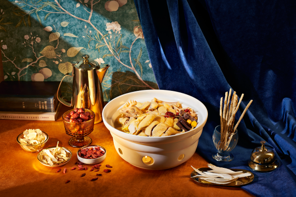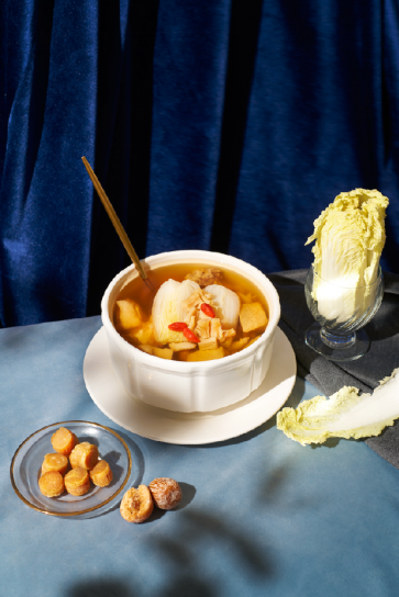 瑤柱菜膽燉土豬展湯,80頭干瑤柱經(jīng)過發(fā)泡,和優(yōu)選食材的土豬肉,娃娃菜一塊入燙盅燉6小時。水甘味甜,有滋補清潤作用。