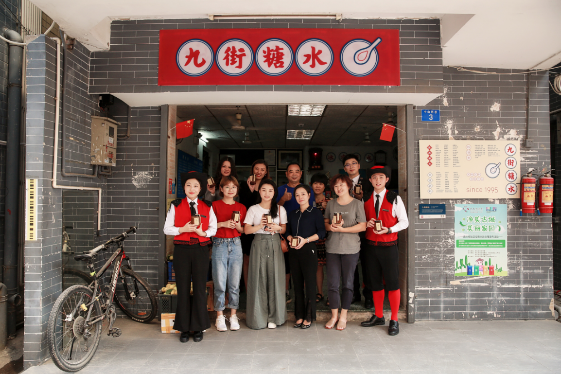 在禮賓司的引領下,大家來到已有千年歷史的文化遺產(chǎn)——南頭古城。一行人在“九街糖水鋪”入座,店主夫妻倆熱情的端出清甜可口的化州糖水和香氣四溢的潮州炒米粉,和我們嘮起了家長里短。大家方才得知,這宛如尋常百姓家的糖水鋪竟開業(yè)于1995年,見證了古城九街的變遷翻新和故去新來的幾代人潮川流。帶著傳播化州糖水美名初衷的糖水世家選擇在深圳發(fā)家,傳到這已是第三代。眾人大快朵頤,禮賓司也幫忙跑堂添茶。