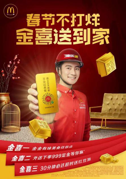 麥當勞外送服務麥樂送在春節(jié)期間也加入“金金”有味的體驗,為餐廳以外的顧客送出三重“金”喜:全系列新品登陸麥樂送平臺,通過麥當勞官方渠道和第三方訂餐平臺都可以下單;麥樂送下單也可以參與抽獎,贏取周大福足金;春節(jié)期間美食30分鐘必達,超時將贈送紅豆派。