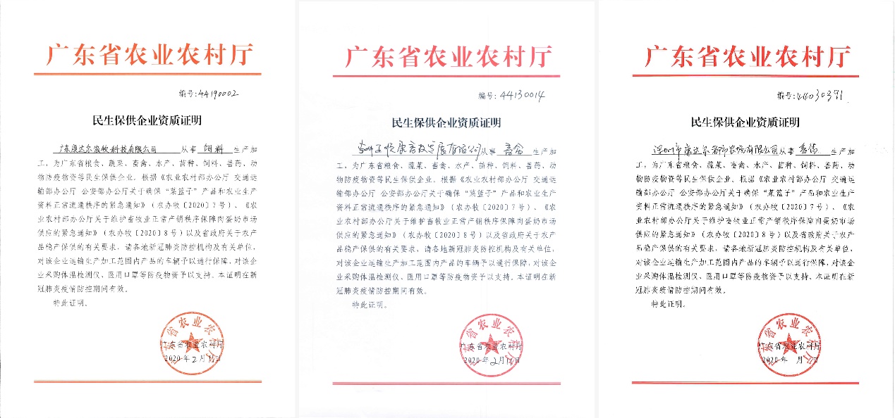 見圳客戶端·深圳新聞網2020年2月13日訊  農產品是群眾生活必需品,農業(yè)生產資料是農業(yè)生產的必需物資。2020年2月11日-12日,康達爾集團農業(yè)板塊三大公司廣東康達爾農牧科技有限公司、惠州正順康畜牧發(fā)展有限公司、深圳市康達爾都市農場有限公司先后獲批“民生保供企業(yè)”資質證明,這將非常有利于各企業(yè)開展農產品和農業(yè)生產資料的保供工作,也意味著康達爾集團在這場防疫保供攻堅戰(zhàn)中所發(fā)揮的作用獲得了高度的肯定。