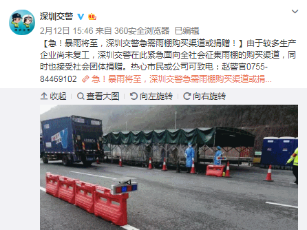 見圳客戶端·深圳新聞網(wǎng)2020年2月14日訊 2月12日下午約4時,深圳交警官方微博的一條消息牽動了深圳紅牛負(fù)責(zé)人張健明的心。該微博寫道:“急!暴雨將至,由于較多生產(chǎn)企業(yè)尚未復(fù)工,深圳交警在此緊急面向全社會征集雨棚的購買渠道,同時也接受社會團體捐贈?!?/span>