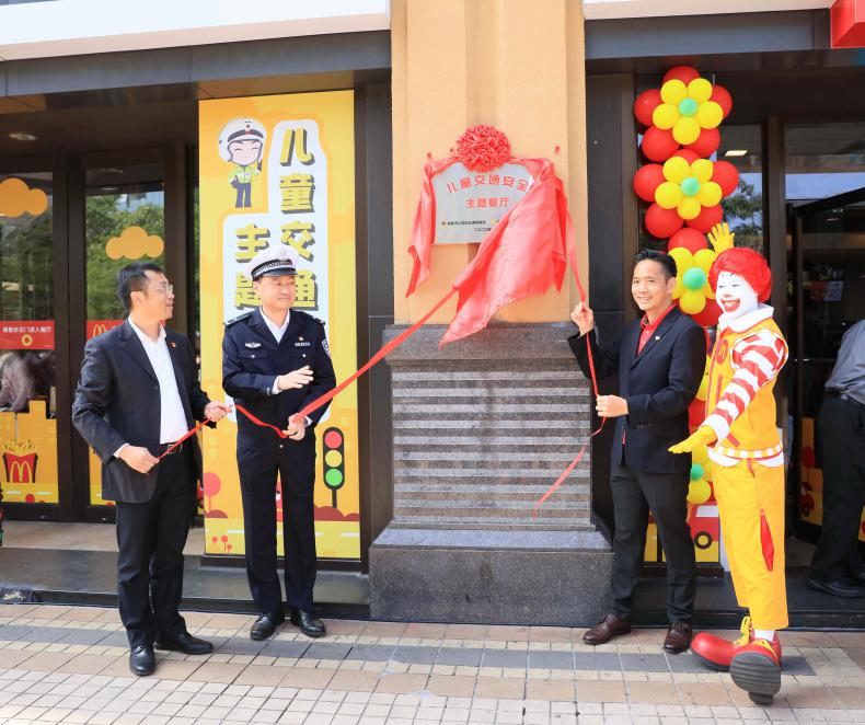 深圳市交警局、福田區(qū)香蜜湖街道辦、深圳麥當(dāng)勞領(lǐng)導(dǎo)與麥當(dāng)勞首席快樂官麥當(dāng)勞叔叔共同為全國首家麥當(dāng)勞兒童交通安全主題餐廳揭牌