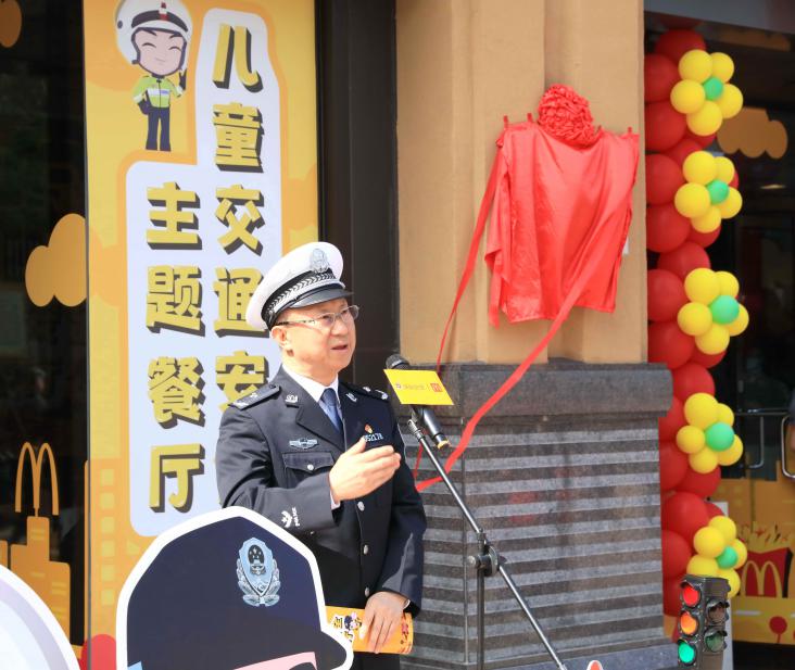 全國首家麥當(dāng)勞兒童交通安全主題餐廳(深圳市福田區(qū)東海城市廣場餐廳)啟動儀式上,深圳市交警局副局長馮新毅致辭