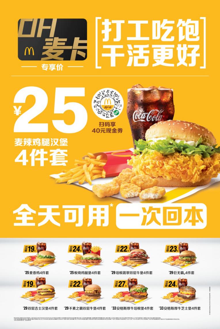 調研還顯示,超過四成的消費者表示希望在餐飲上節(jié)約至少10%的支出,而麥當勞的“打工人保底計劃”提供了多種大力度的優(yōu)惠。以午餐為例,消費者若購買OH麥卡,享用超值四件套即可至少節(jié)省19元,即減少39%的開支。