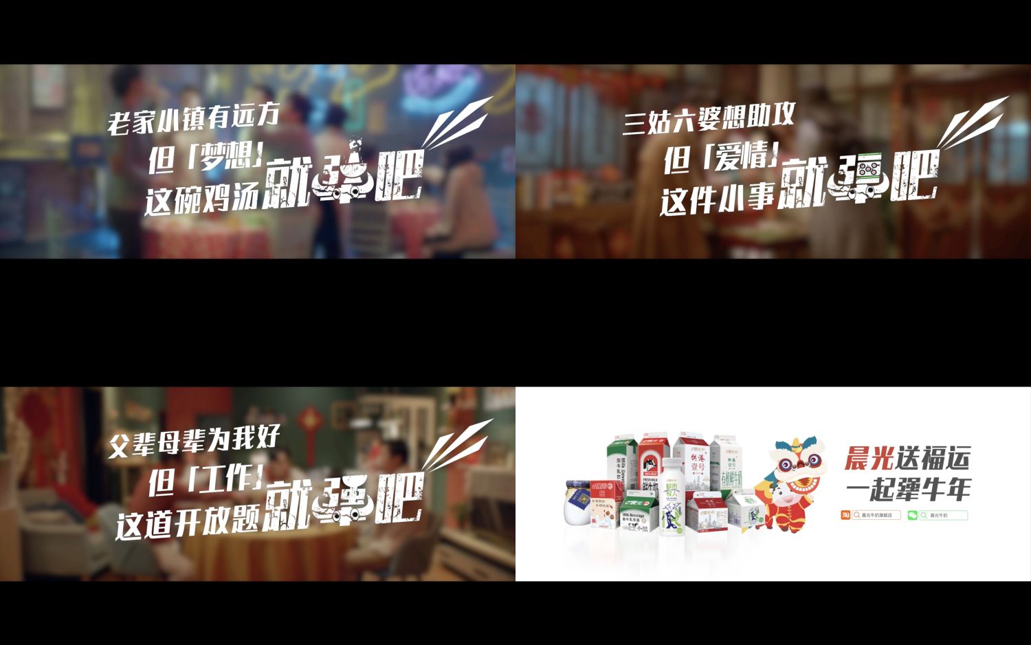 1月29日,晨光乳業(yè)《就犟吧》賀歲TVC微信、朋友圈正式上線,就春節(jié)熱門話題“結婚、找穩(wěn)定工作、要不要外出追夢”進行了生動演繹。在熱鬧喜慶的年節(jié)氛圍中,趣味反轉的劇情,形象展現(xiàn)了新一代年輕人對于工作、愛情、夢想“不服輸、敢堅持”的態(tài)度。
