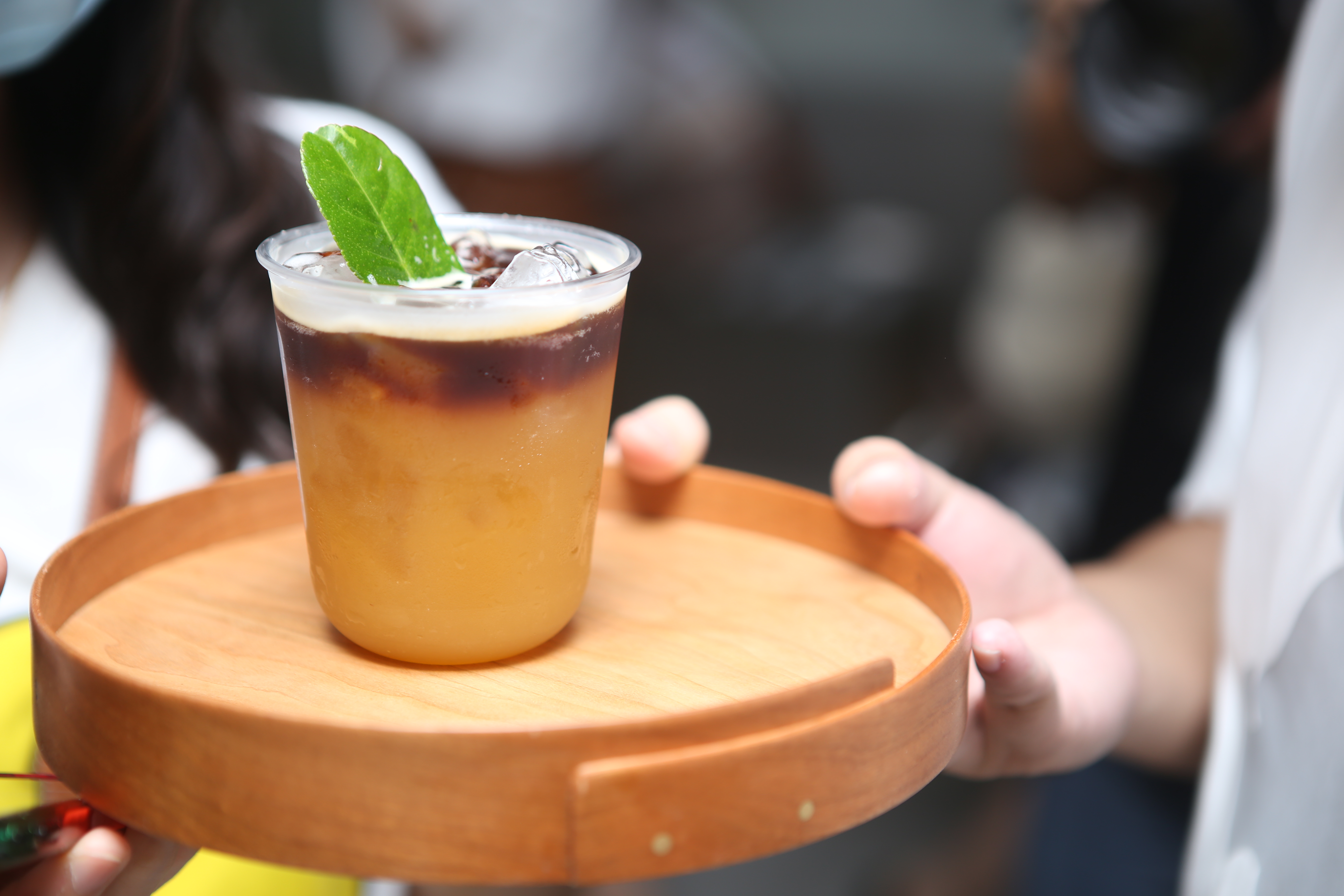(門店工作人員熱情地為排隊(duì)顧客送上茶飲解渴)