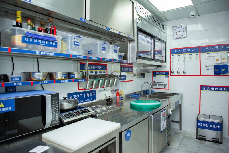 “右手邊是冷菜間,因為食安要求更高,我們都有專門的‘二次更衣室’,在這里更換衣服后,再進入對涼菜進行處理?!必撠熑吮硎?,在專門的涼菜區(qū)里,則可以看到櫥窗中整齊地貼上了諸如“A1圣女果”“B04魚豆腐”之類的標簽,同時備注“當天生產(chǎn)打烊廢棄”和“加工日期與廢棄日期”等具體操作指示?!懊客泶蜢群螅覀円矔米贤饩€燈對冷菜間進行半個小時的消毒。”負責人補充。