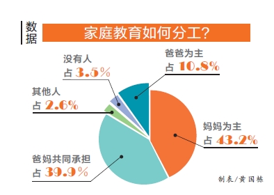 此次調(diào)查中,用14個指標(biāo)考察家庭教育分工情況,包括:輔導(dǎo)孩子學(xué)習(xí)、培養(yǎng)孩子特長、接送孩子上下學(xué)、開家長會、培養(yǎng)孩子日常行為習(xí)慣、糾正孩子的不良行為、教孩子明辨是非、照顧孩子的飲食起居、和孩子一起游戲及和孩子聊天。統(tǒng)計(jì)數(shù)據(jù)顯示,家庭教育分工中,“媽媽為主”的家庭占43.2%,“爸爸為主”占10.8%,“爸媽共同承擔(dān)”占39.9%,“其他人做”占2.6%,“沒有人做”占3.5%。