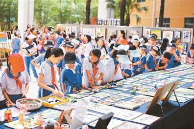 師生才藝競(jìng)技場(chǎng)上展出的400余件精美畫作均為師生的“四點(diǎn)半課程”成果。