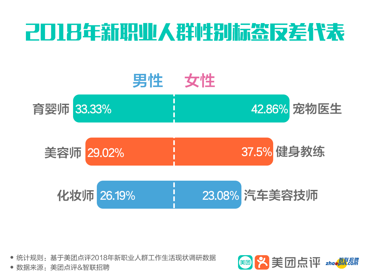 隨著社會觀念的發(fā)展進步和就業(yè)群體的年輕化,越來越多的年輕人以“興趣為導(dǎo)向”,堅持“自我”、“率性”、“不畏人言”,其就業(yè)觀與傳統(tǒng)大眾視角逐漸形成反差。報告發(fā)現(xiàn),寵物醫(yī)生、全屋定制設(shè)計師、汽車美容技師等新職業(yè),盡管勞動強度大、工作時間長、體力消耗嚴重,但已經(jīng)有大量的女性涉足。數(shù)據(jù)顯示,在男性標簽更強的汽車美容技師中,女性占比達到了23.08%;在勞動強度較大的寵物醫(yī)生中,女性占比高達42.86%。