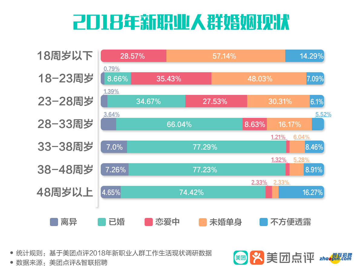 據(jù)《人民日報》報道,近30年來,年輕人晚婚的現(xiàn)象越來越明顯。在新職業(yè)人群中,婚姻狀態(tài)也符合了這一社會趨勢。數(shù)據(jù)顯示,在新職業(yè)人群中,僅僅有34.67%的90后(23-28周歲)已經(jīng)結(jié)婚,85后(28-33周歲)的已婚率則達到了66.04%,到了80后(33-38周歲),已婚率提高到了77.29%,這個數(shù)據(jù)符合大眾的普遍認知。