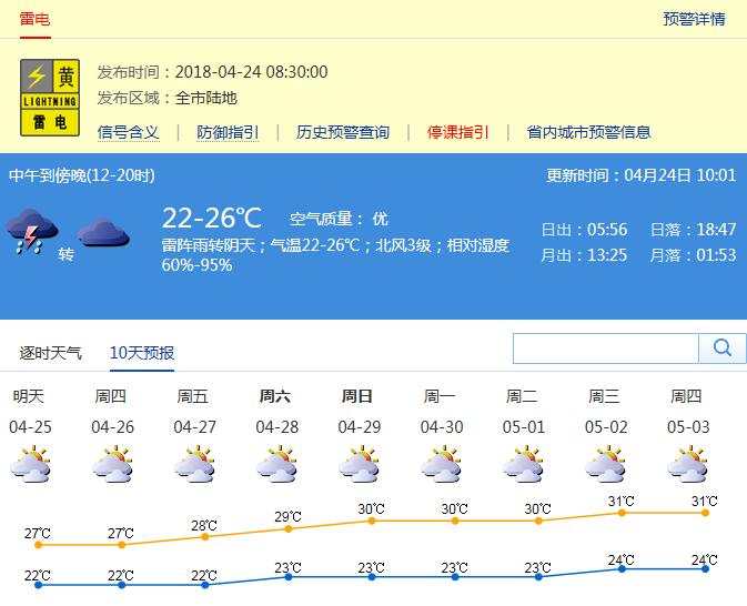 【深圳市雷電預(yù)警】深圳市氣象臺(tái)于2018年04月24日08時(shí)30分在全市陸地發(fā)布雷電預(yù)警,預(yù)計(jì)30分鐘內(nèi)全市將受雷電影響,按照防御預(yù)案停止戶外易燃易爆危險(xiǎn)作業(yè),并加強(qiáng)?;瘓?chǎng)所安全管理。